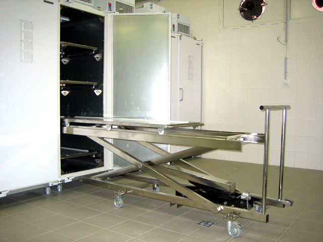 We make a special coffin conveyer system which connects the catafalque with the incinerator under the floor-ing. This up-to-date technology conveys the coffin with the dead body from the catafalque to the crematorium, directly to the crematorium incinerators.